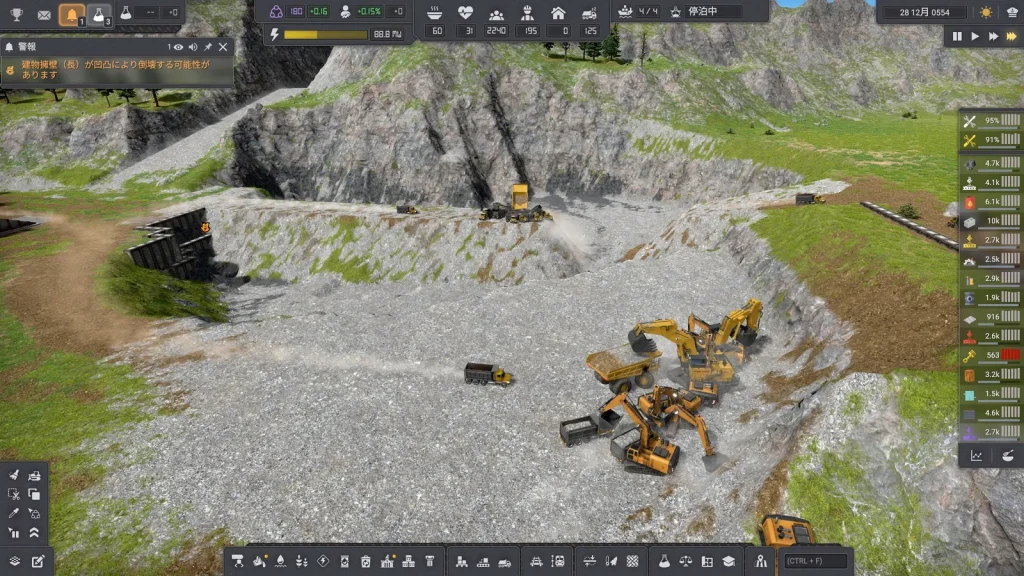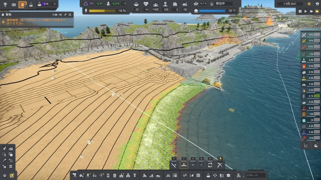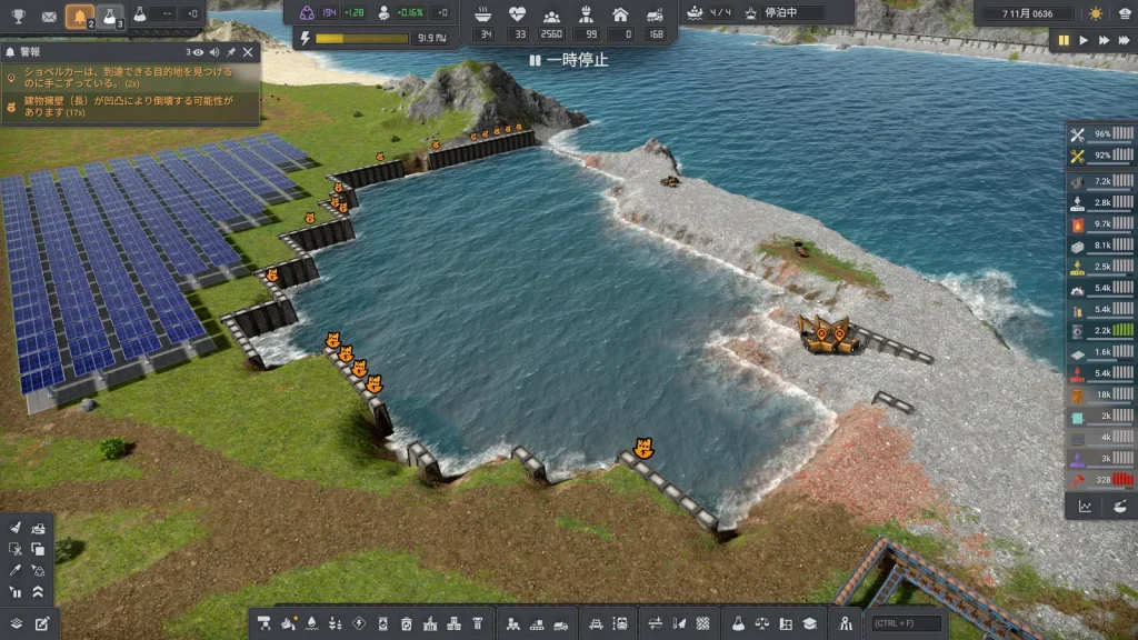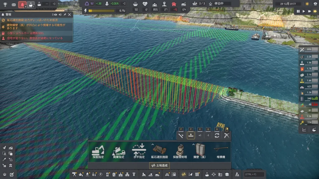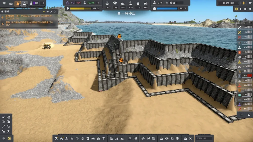 あーーーー!!鉱山が水没!!海側の壁が崩れて水没してしまいました。さすがにこれはやばいので崩壊前のセーブデータをロードして擁壁を建設しました。人生もセーブデータが読み直せればいいのに。