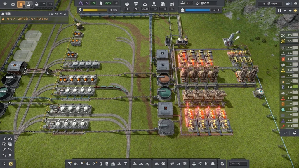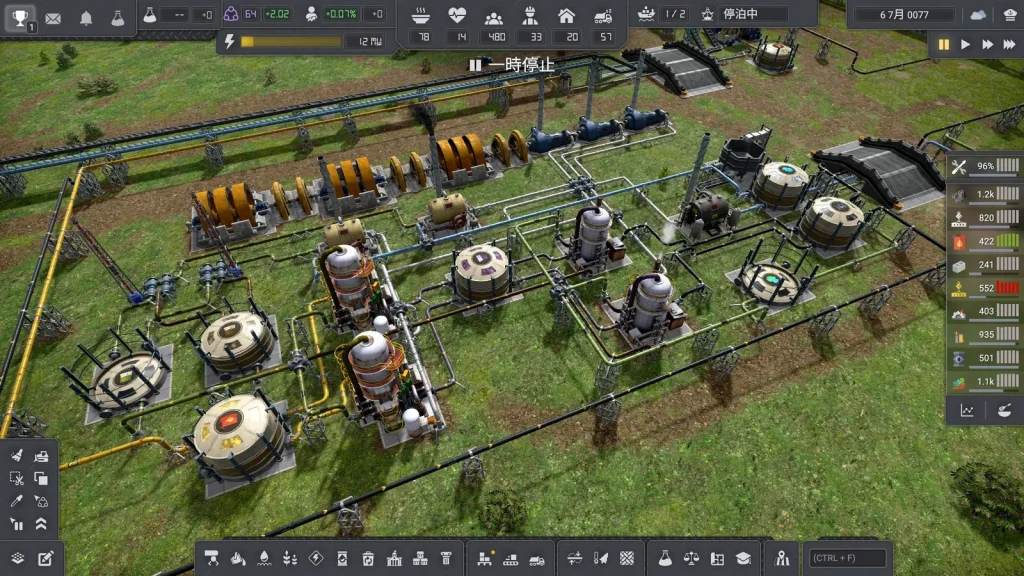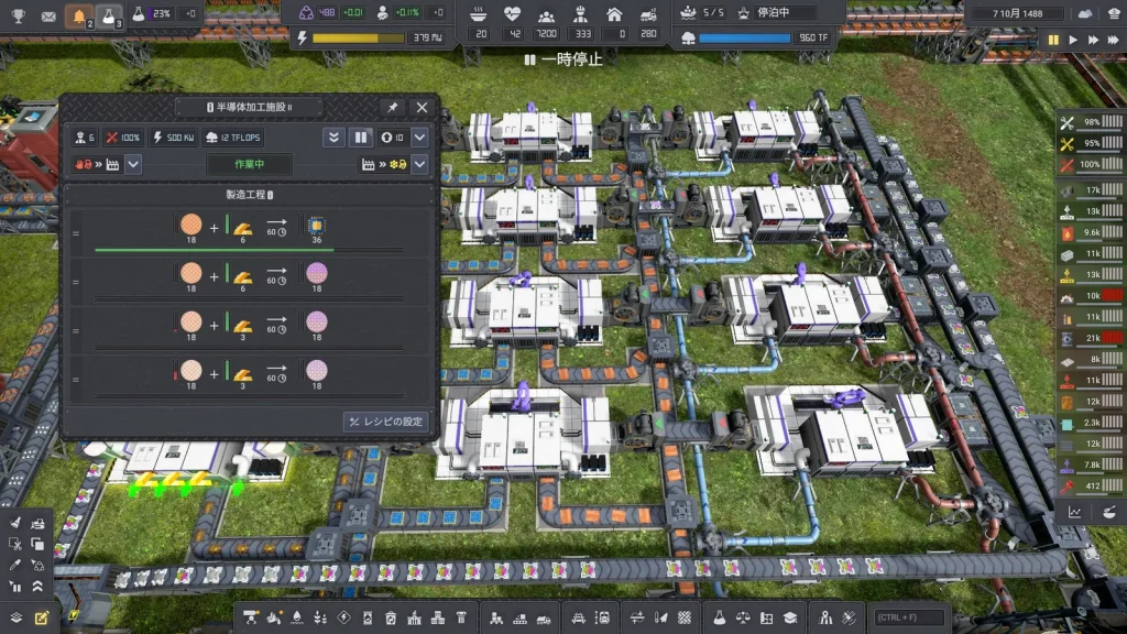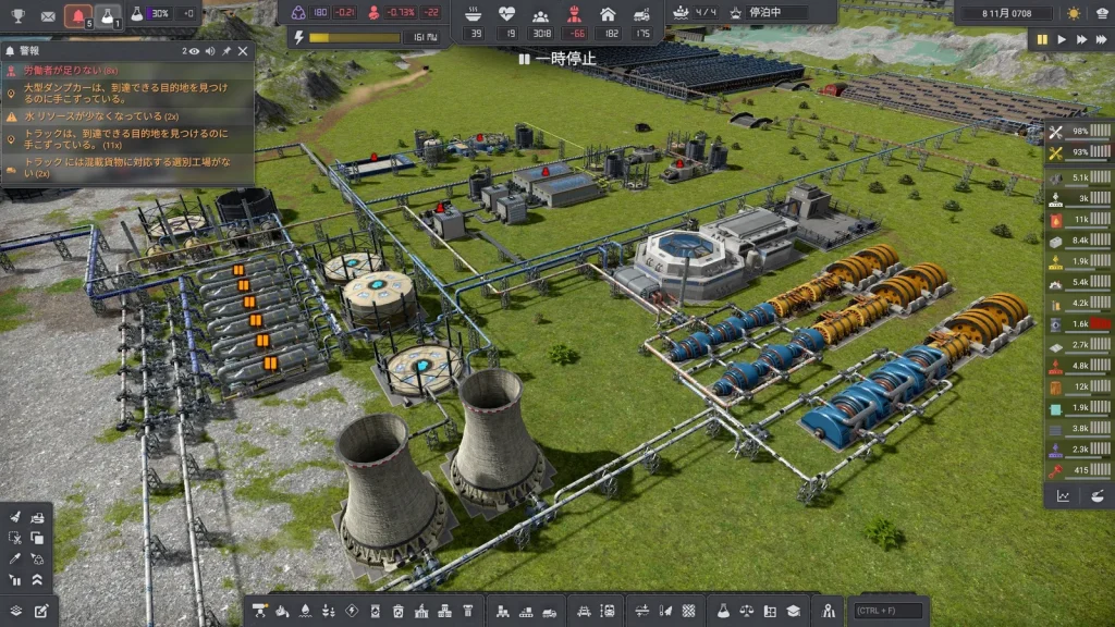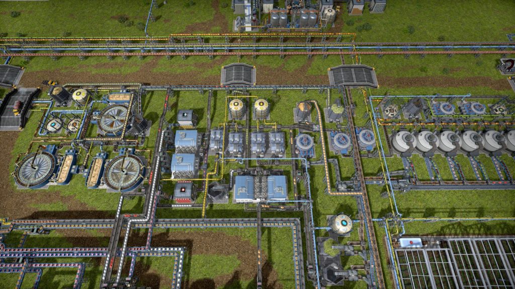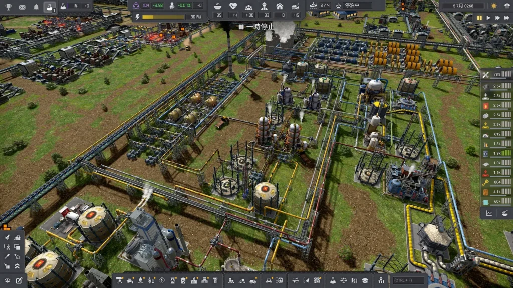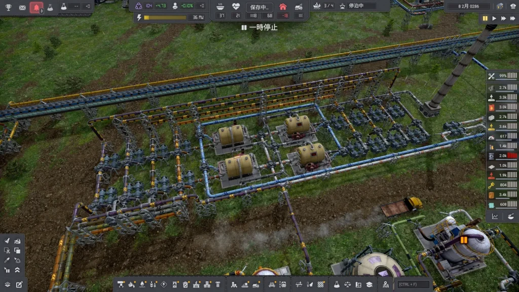 石油系工場の悩みは生産調整がとても難しいところです。このゲームは複数の素材を入力して複数の製品が出ていく、鬼畜レシピばかりです。1種類でも出力が余ればすべてが止まってしまうので、止まらないようにすることが肝心です。Satisfactoryのように捨てることはできず、一応焼却するという手もありますが大気汚染が発生して住民が病気になるので、安易に捨てることもできません。