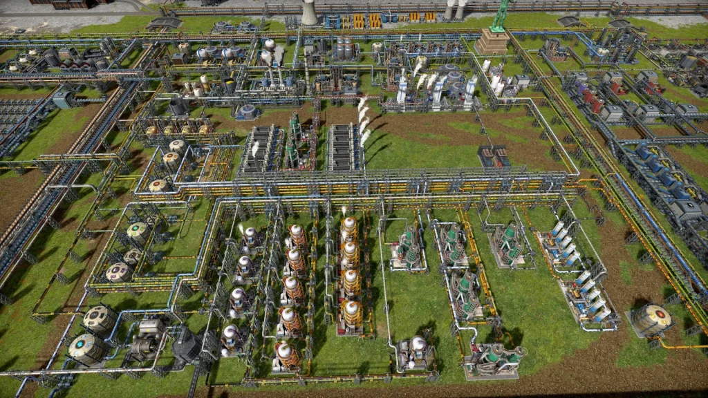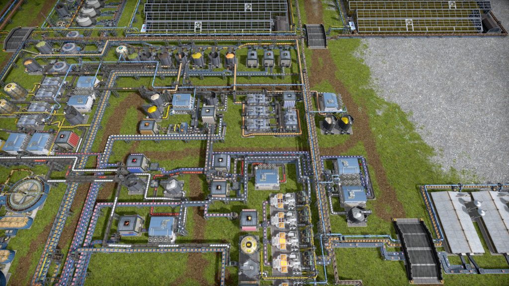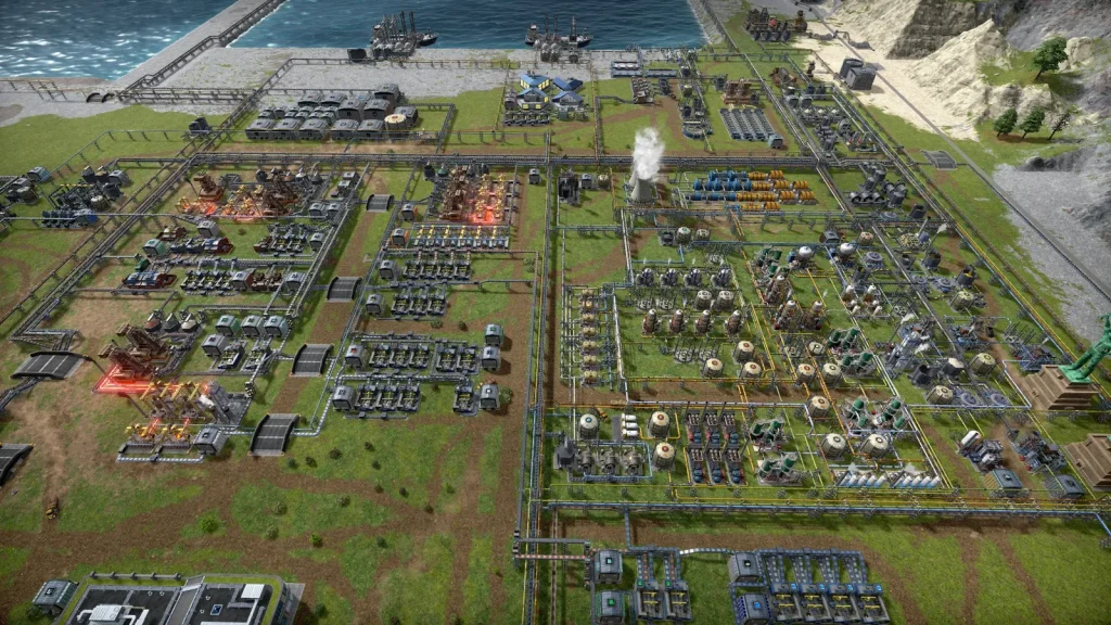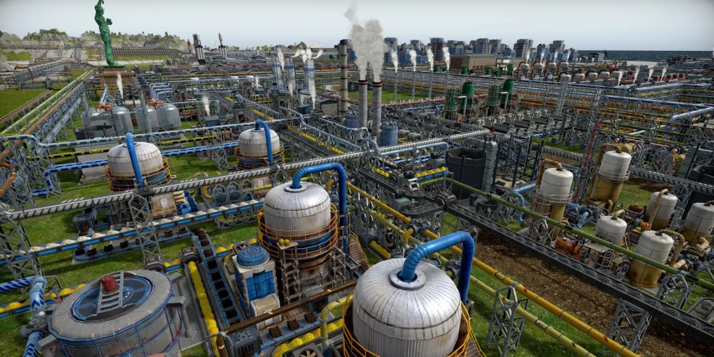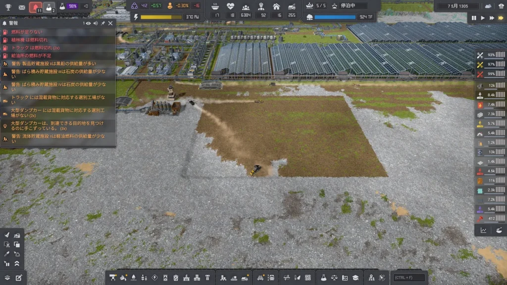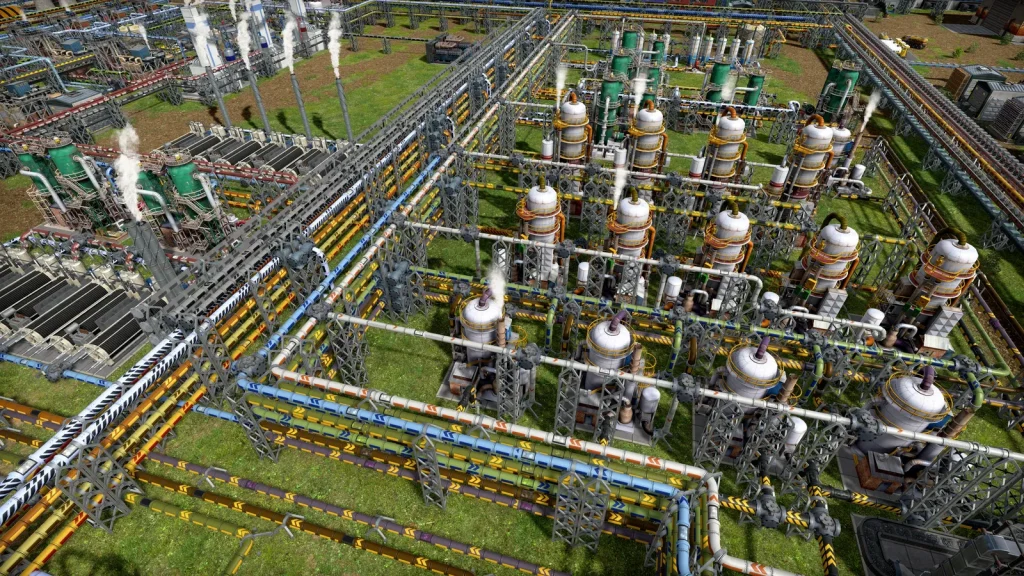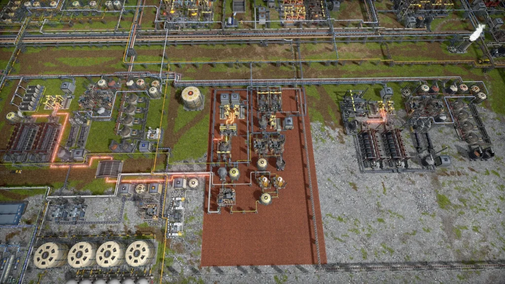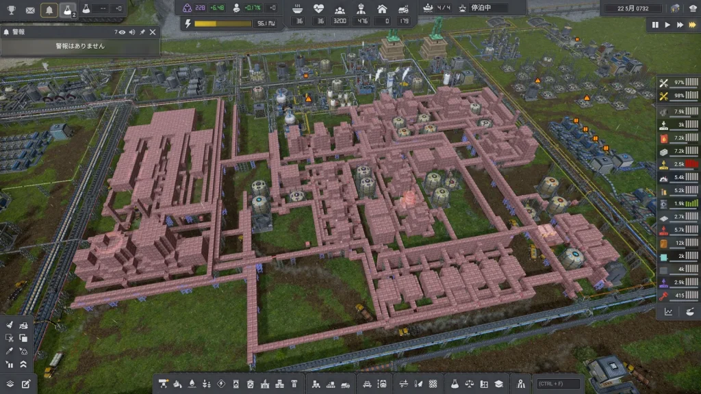 石油系工場の悩みは生産調整がとても難しいところです。このゲームは複数の素材を入力して複数の製品が出ていく、鬼畜レシピばかりです。1種類でも出力が余ればすべてが止まってしまうので、止まらないようにすることが肝心です。Satisfactoryのように捨てることはできず、一応焼却するという手もありますが大気汚染が発生して住民が病気になるので、安易に捨てることもできません。