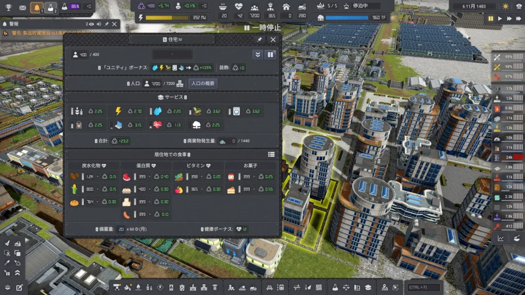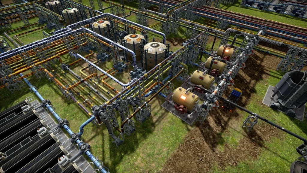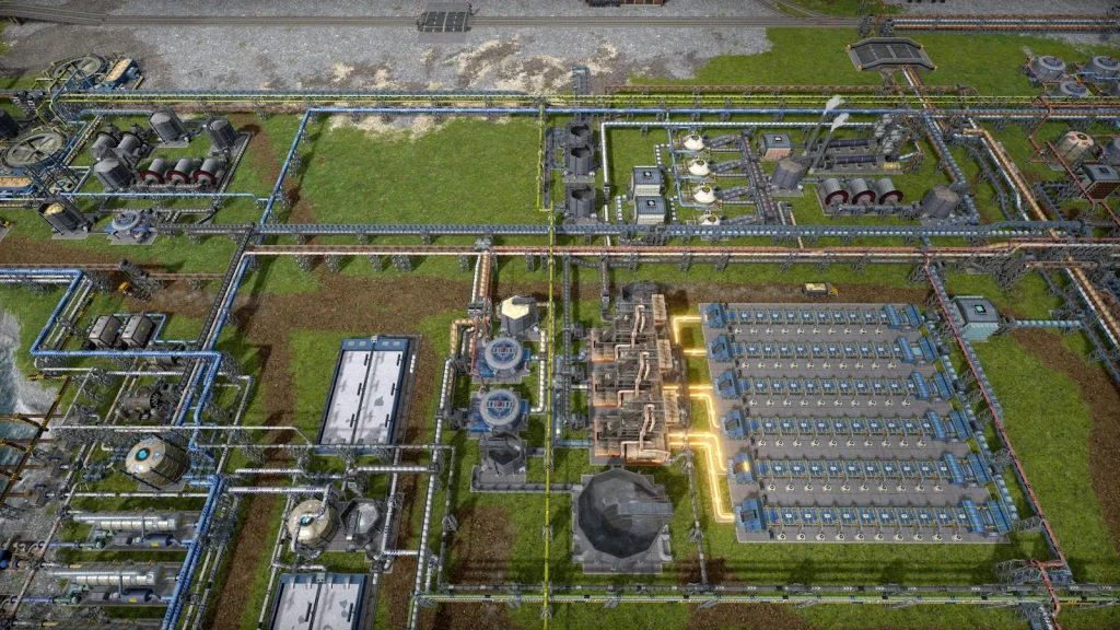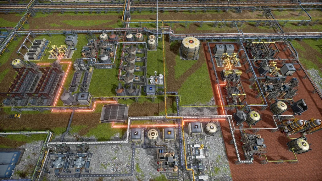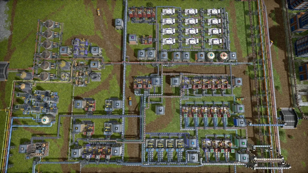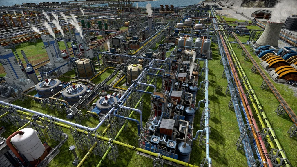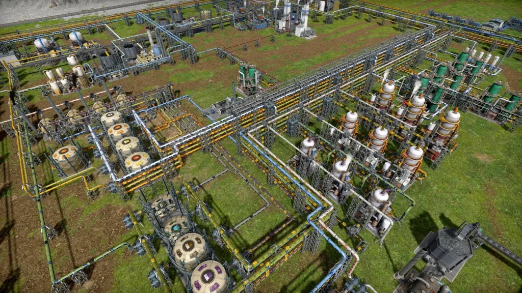 石油系工場の悩みは生産調整がとても難しいところです。このゲームは複数の素材を入力して複数の製品が出ていく、鬼畜レシピばかりです。1種類でも出力が余ればすべてが止まってしまうので、止まらないようにすることが肝心です。Satisfactoryのように捨てることはできず、一応焼却するという手もありますが大気汚染が発生して住民が病気になるので、安易に捨てることもできません。