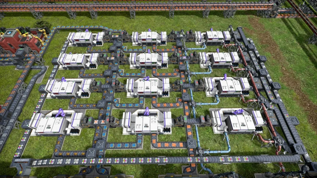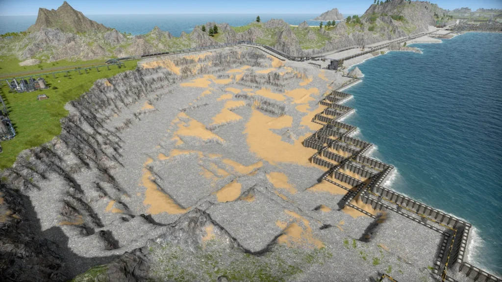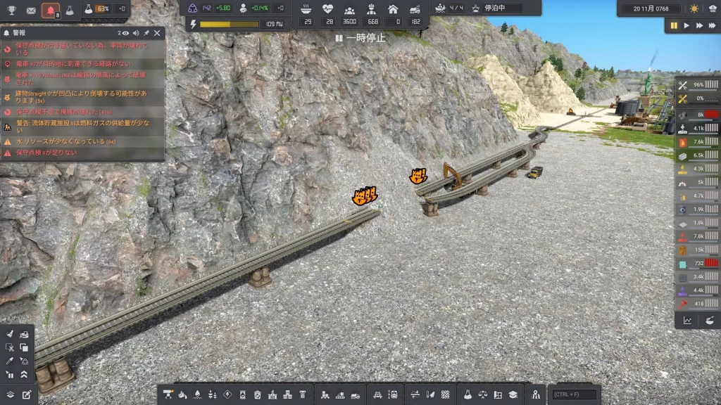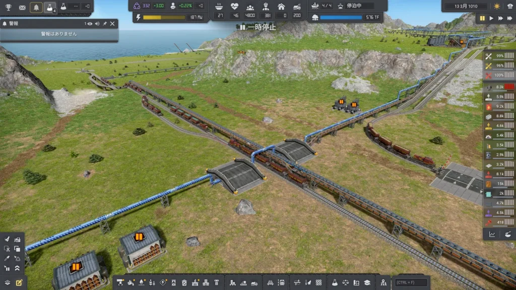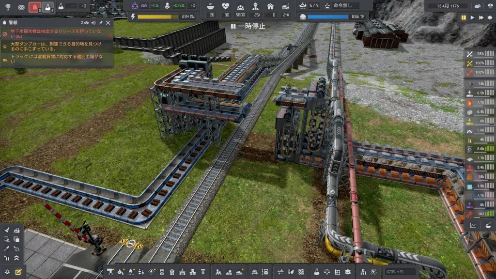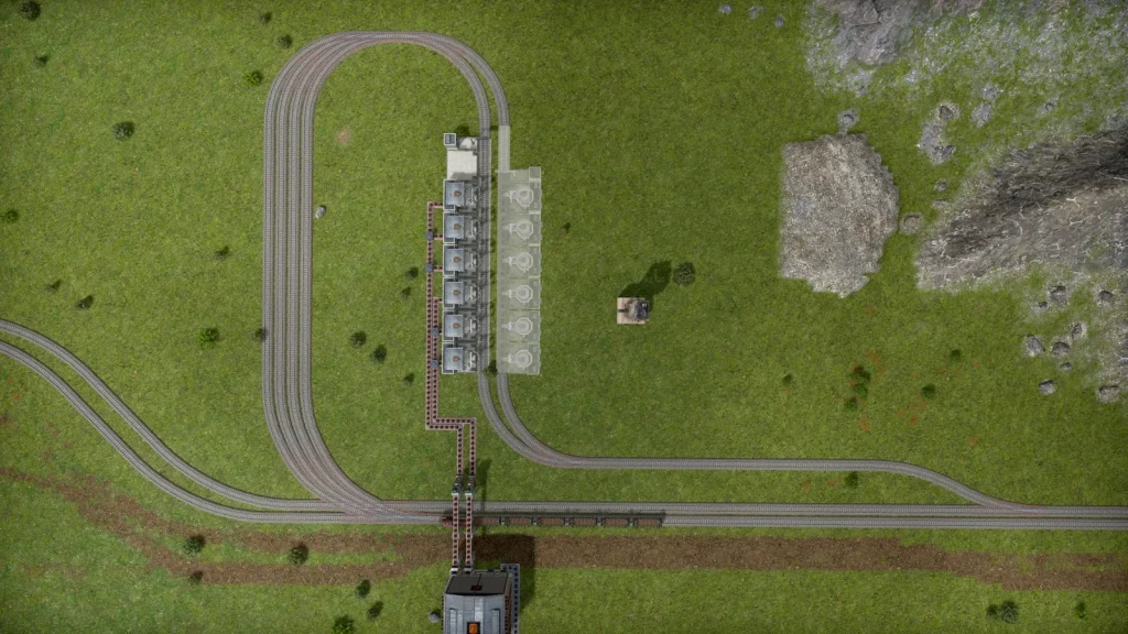 Satisfactoryの鉄道輸送では大量の物資を運べましたが、このゲームの鉄道輸送は非常に少なく、中盤まではトラックで輸送した方が早いくらいです。貨物1両でトラック2台分しか運べません。しかし後半では鉱山がどんどん遠くになっていくので、容易に本数を増やせる鉄道の方が効率が良くなってきます。また鉄道は一度敷設すると、遠くの鉱山まで延伸するときも同じ線路が使えて便利です。