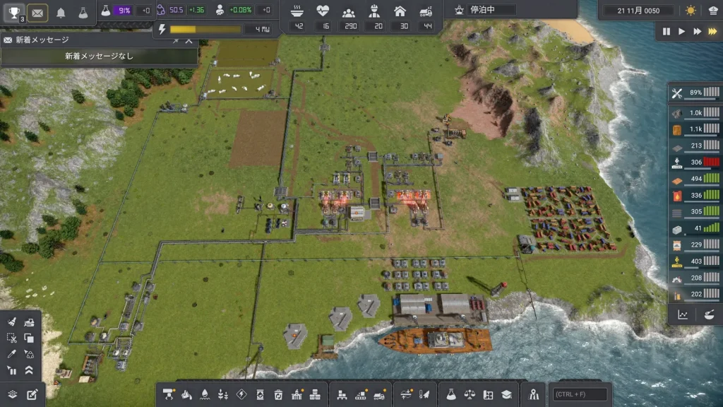 ロケット発射場のさらに奥には医薬品を製造する工場があります。序盤~中盤はそんなに重要性は高くなく、灯台を稼働させていれば勝手に難民が入ってくるのでいいんですが、後半は人も増えて一気に減ったりするので重要になってきます。