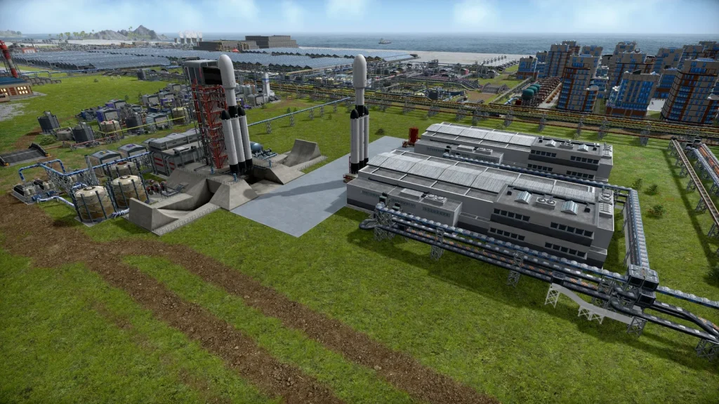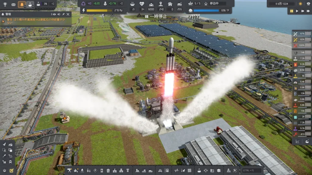 半導体工場の奥にはロケット製造棟と発射場があります。当初このゲームはロケットを打ち上げでクリアとなりましたが、Updateでさらに続きが追加されました。ロケットを打ち上げて宇宙探索をして、惑星を見つけ、惑星を地上に落下させるというものです。惑星には鉄鉱石などの素材があるので、資源が枯渇してもおかわりができるようになりました。