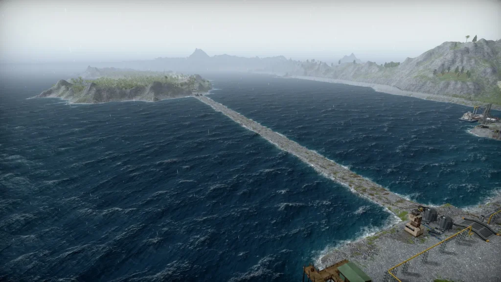離島への道を作っている様子。これは後で気づいたのですが、緑色の縞々の線は船の航路で、これを塞いではいけなかったようです。結局船着き場を移動する羽目になりました。