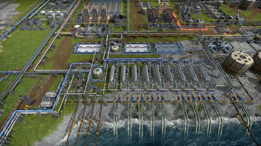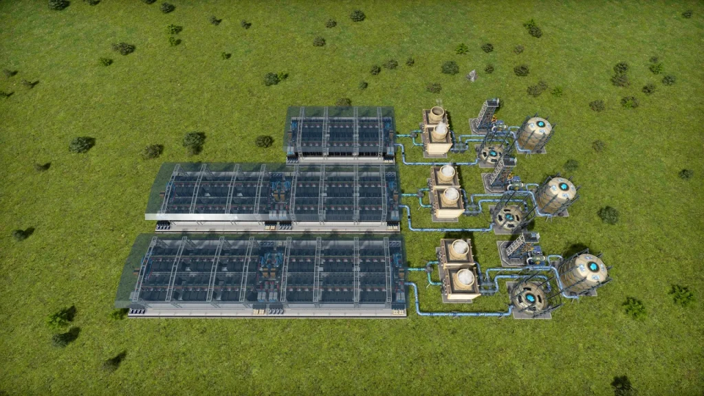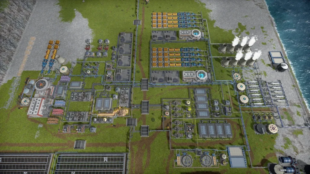 ガラス工場の隣には淡水化施設があります。大量に水を消費するので海水をくみ上げて水を作っていますが、それでも足りず、マップのあちこちから水を引いています。このときに余った塩水を使って塩も生産しています。