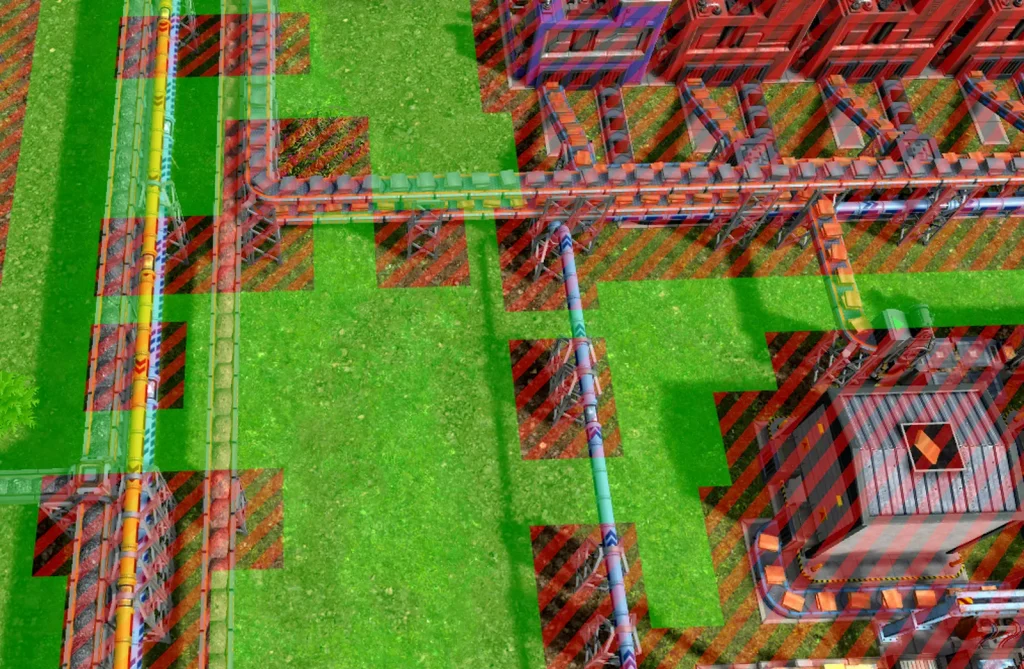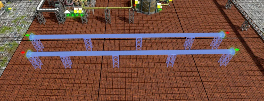 ベルトコンベアや配管を引くとき、支柱の間隔が 広・広・広・狭のように等間隔で並びません。このせいで左から引いたときと右から引いたときで柱の位置が合わなくなってきます。このようにずれた状態で並行に3本引くと、トラックが通るために必要な3マスが確保できなくなってしまうため、既存の柱に合わせて1つ1つクリックしていくという面倒な作業が発生します。