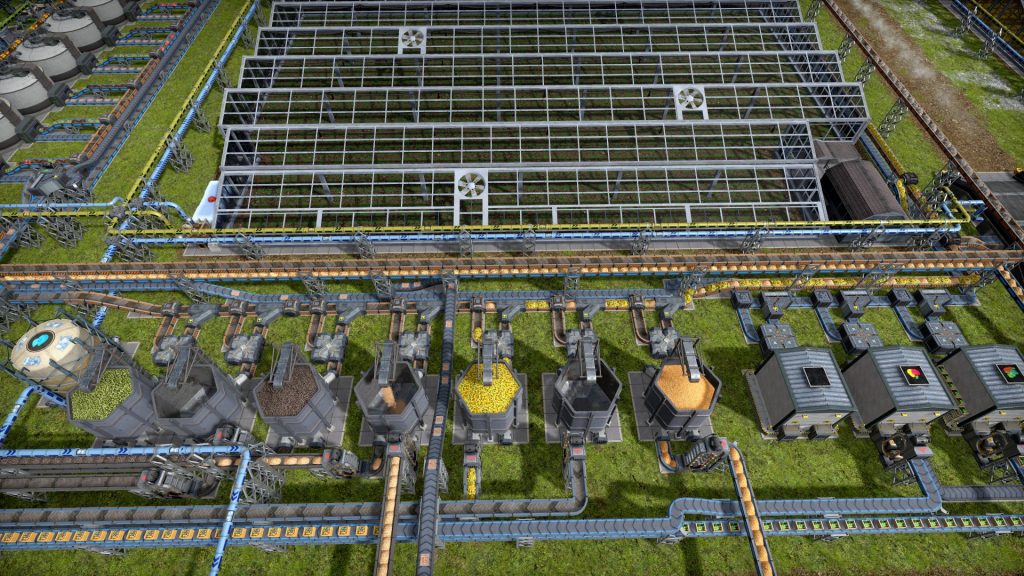農場は広大な土地を必要とするため更に奥の方に作り、作物は2つのベルトコンベアにまとめて輸送しています。このエリアは元々凸凹なエリアでしたが、必要になる前に少しずつ平地にしていったので、必要な時に十分なスペースを確保することができました。