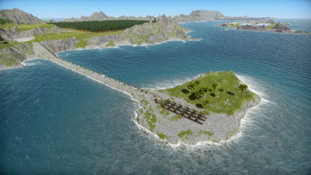 このゲームには橋や船輸送(自国内)がありません。本土から離れた離島に行くには海を埋め立てて道を作るしかありません。これには非常に時間がかかるので、廃棄する岩や土、スラグなどをコンベアで輸送して作っていきました。