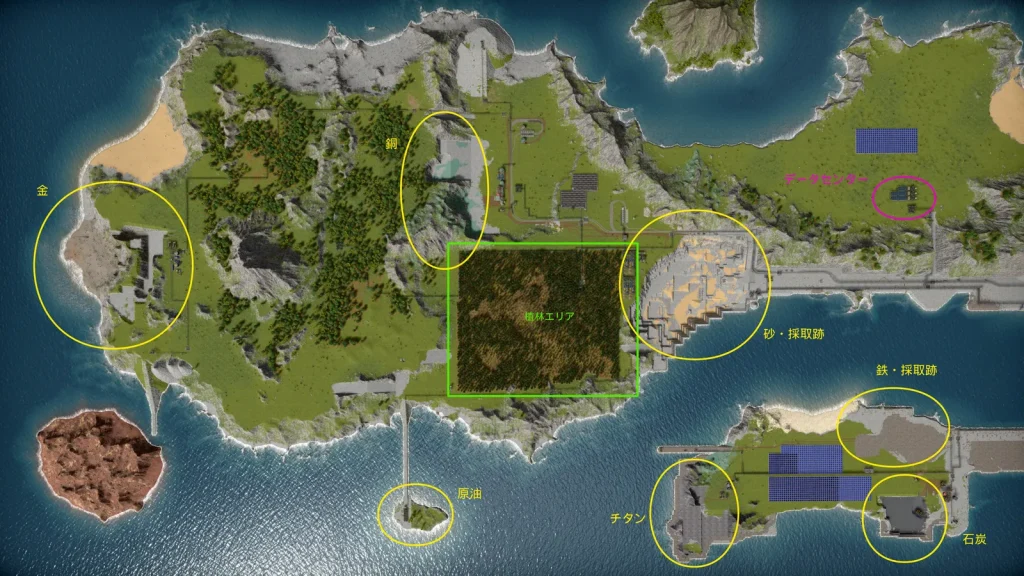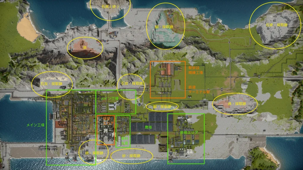 このゲームの序盤では鉄・基礎部品、銅・基礎部品のエリアから拡大していきました。地面の色が灰色になっているところが埋め立て地で、当初は海でした。