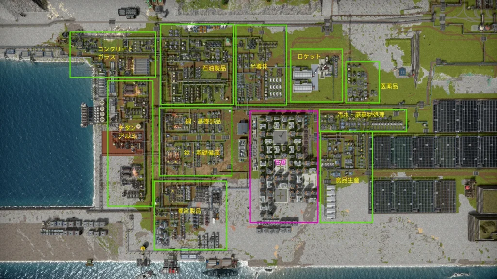 この辺は半導体など、主に電子関連の工場が集まっています。右下にはプリント基板や電子回路の工場があり、右上にはウェハーから集積回路を生産する工場があります。左上は金の精錬工場で、元々は贅沢品の製造がメインでしたが、集積回路でも使用されています。左下はロケット関連の工場で、電子部品を多用するので近くに設置しました。