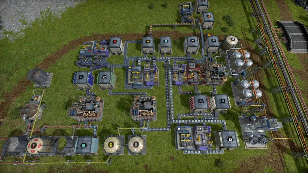 トラックが通るには3マスの空きブロックが必要です。構造物の周囲1ブロックは通路にできないため、建物と建物の間は3マス開けないといけません。ベルトコンベアの支柱も同様なため、トラックが通れるようにするために注意が必要です。
