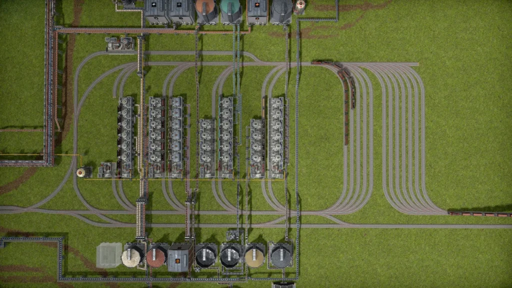 駅の構造はCaptain of Industoryのフォーラムなどを参考に作ってみました。特徴的なのは右側に見える待機線。駅が空くまで個別に待機できるようにしないと、後続の列車が詰まってしまいます。このゲームには信号機がないので、線路の敷き方には少し戸惑うところもありました。右側から入ってきても、左側から入ってきても、どちらでも出入りができます。
