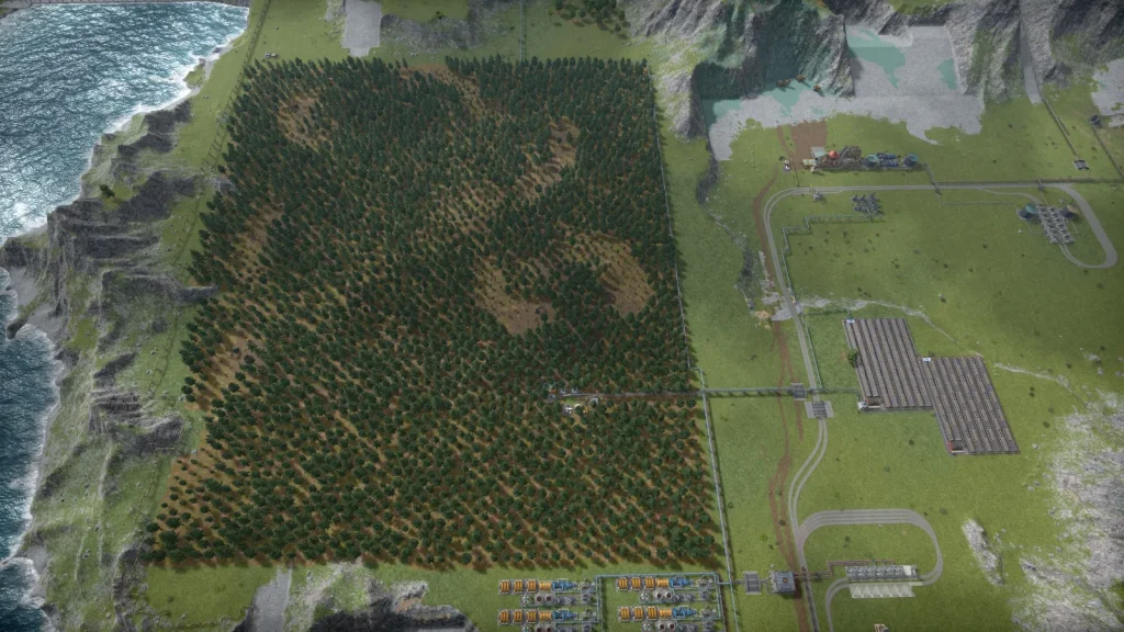 そこでアホみたいに巨大な植林場を作ってみました。右側の農場の大きさと比べてみてもらえれば、この巨大さがわかると思います。実際のところこんなに必要はなかったんですが、木材が取れるまでは非常に長い年月がかかり、どのくらいの量が取れるのかが全く分からなかったので、こんだけでかけりゃいいだろうって感じ作りました。