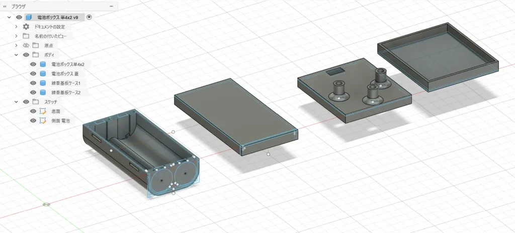 電池と基板を収めるケースを作っていきます。3Dモデルは こちら にアップロードしました。