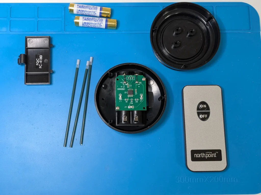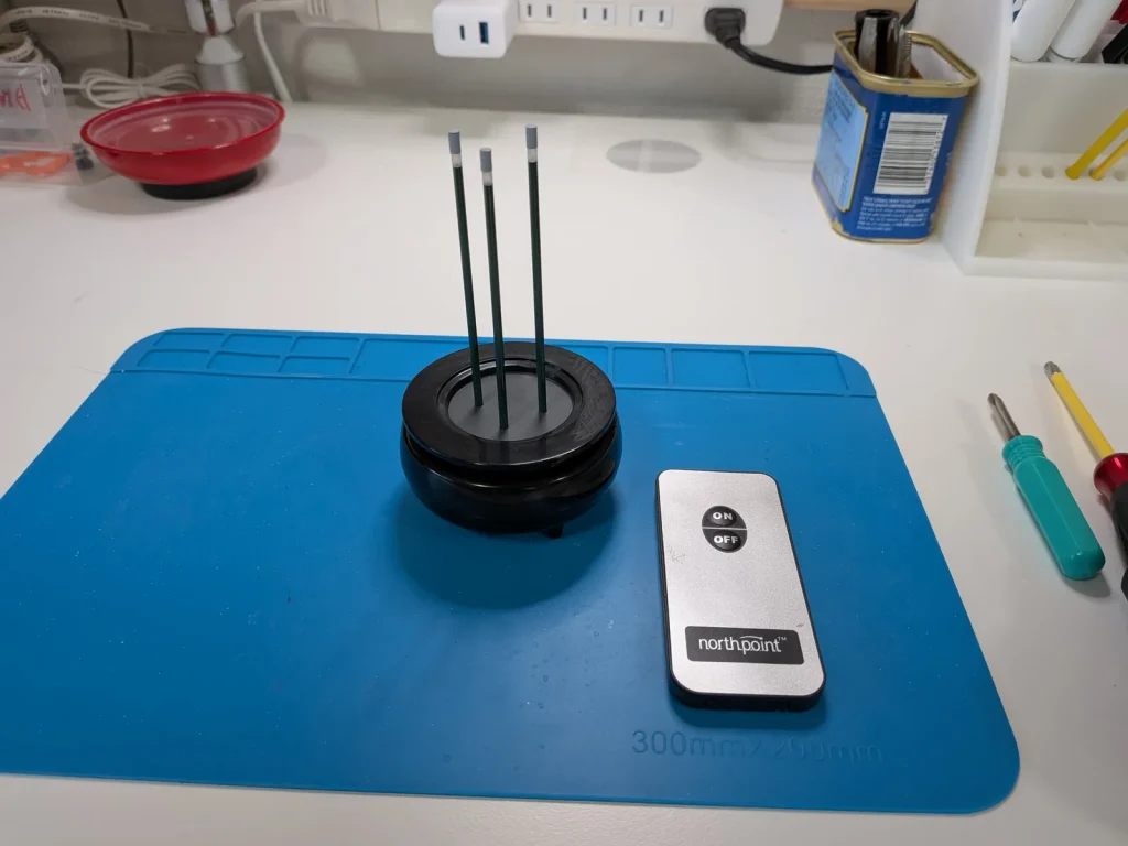 ファインという会社のリモコン式 安心 LED お線香 ミニⅢ FIN-1025を買ったのですが、この製品は線香の部分が他社製品より手の込んだ作りになっていて、わりと線香ぽく良くできています。ところがプラスチック製の香炉のせいでチープさが目立つのが残念なところ。そこで今回はこのプラスチック製の入れ物を使わずに、中の基板とLED線香を取り出して、普通の香炉の中に入れて使えるようにしたいと思います。