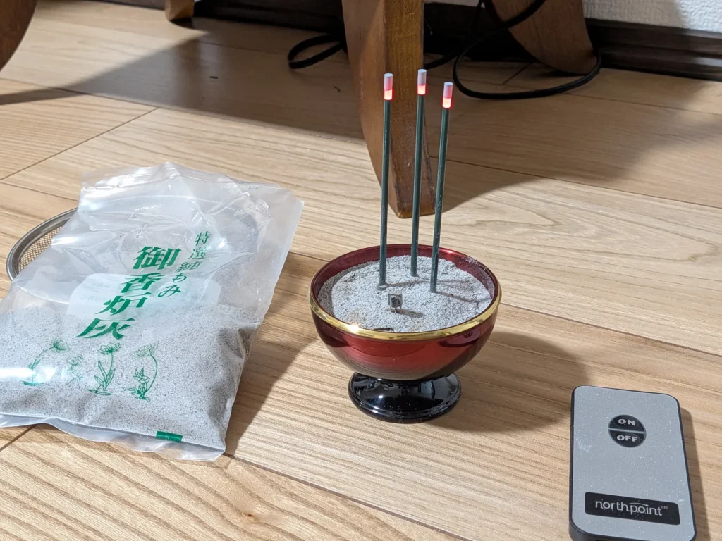 ぱっと見LED線香だとはわかりませんね。赤外線の受光部がひょっこり顔を出してますが、多少灰がかぶってても問題なく操作できます。