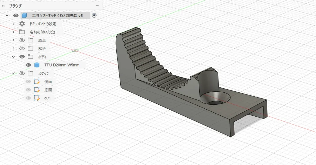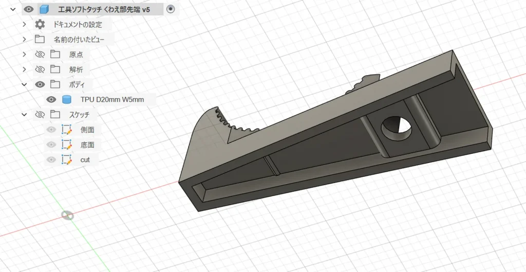 このペンチは先端の樹脂部分が交換式になっているので、形さえ合えば別に純正のスペアパーツでなくても取り付けることができます。ということでFusion360でフィッティングの形状にあった「くわえ部」を作ってみました。