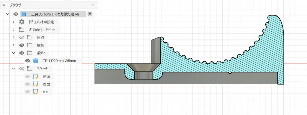 断面はこんな感じ。ギザギザの部分が滑り防止になっています。当初はTPUで作っていたのですが、PLAでも普通に使えたのでPLAで出力すればいいでしょう。滑ってしまう場合はTPUがいいですが、下の空洞部分が難しいところですね。異素材(TPU+PLA)でサポートを付けるか、横にしてツリー型のサポートを付けて後でカットするか。