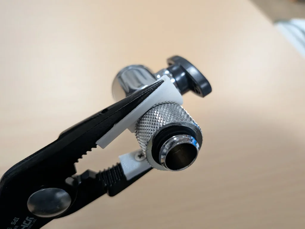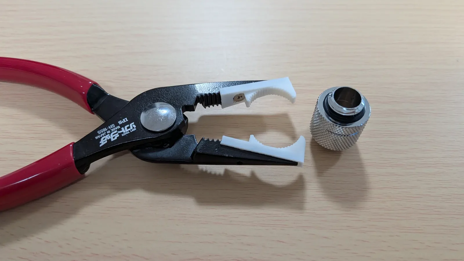 水冷PCの組み立てで回転式のフィッティングをよく使うのですが、回転側を回すと固定していた側も一緒に回ってしまうことがあり苦労していました。フィッティングにキズを付けないようにIPS PLIERS ソフトタッチ スリム SH-165Sというラジオペンチを買ったのですが、ソフトという割には結構硬いんですよね。それにフィッティングは丸い形状なので滑ってしまい、かなり力を入れる必要があります。