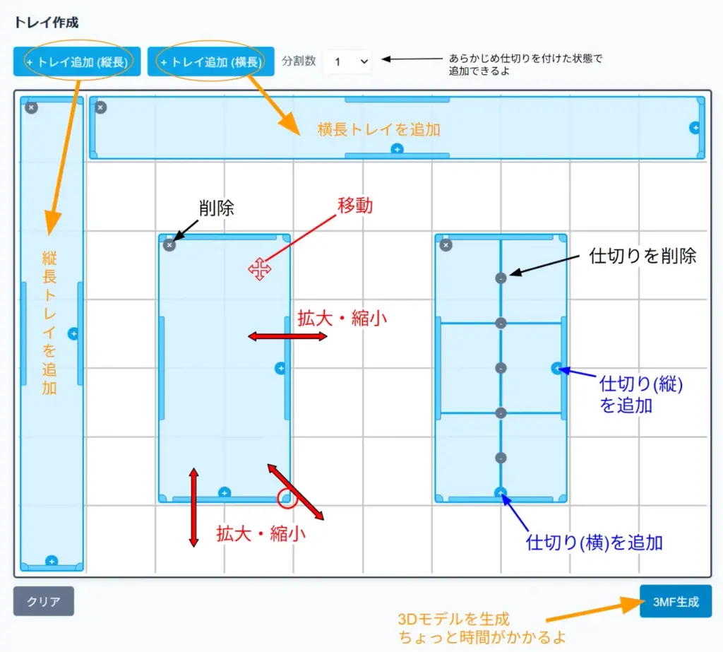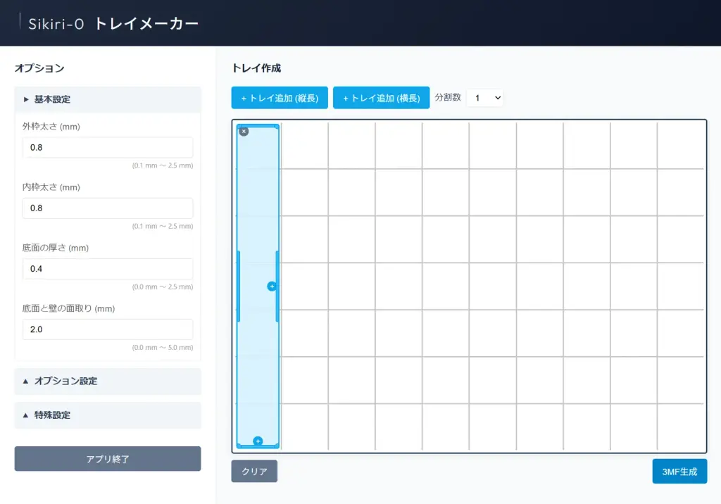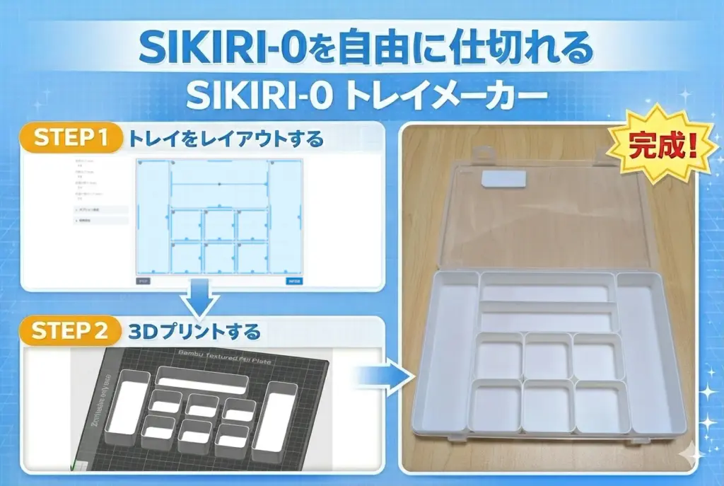 100均の収納ケース SIKIRI-0 を自在に仕切れる『SIKIRI-0 トレイメーカー』をリリースしました!ブラウザ上でトレイのレイアウトを設計すると、3Dプリントが可能な .3mf形式のファイルがダウンロードできるサービスです。今回は作成した経緯や、どうやって動いているのかなどを書いていきたいと思います。使用方法についてはこちらのページをご覧ください。