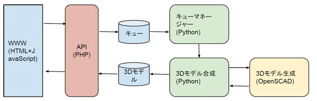 Web側は受付のみに徹し、直接3Dモデルの生成は実行しません。一旦キューにデータを保存したら、完了するまで待機します。キューマネージャーはキューの状態を監視し、新しいキューがあったら1つだけ取り出して3Dモデル合成プログラムを実行します。3Dモデル合成プログラムは必要な数だけOpenSCADを実行して、生成されたSTLファイルを合成し、1つの3MFファイルを作成します。3MFファイルが完成するとWeb UIにダウンロードボタンが現れる仕組みです。
