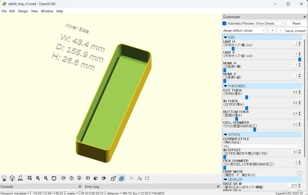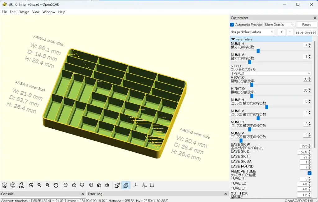 最初に作ったものは、SIKIRI-0にすっぽり入るサイズの大きなトレイを自動生成するものでした。OpenSCADという、3Dモデルをプログラミング言語で記述して生成できるCADツールを使用しました。サイズを変えたり個数が変わるような3Dモデルを作るには、このようなプログラムで生成できるツールの方が適しています。