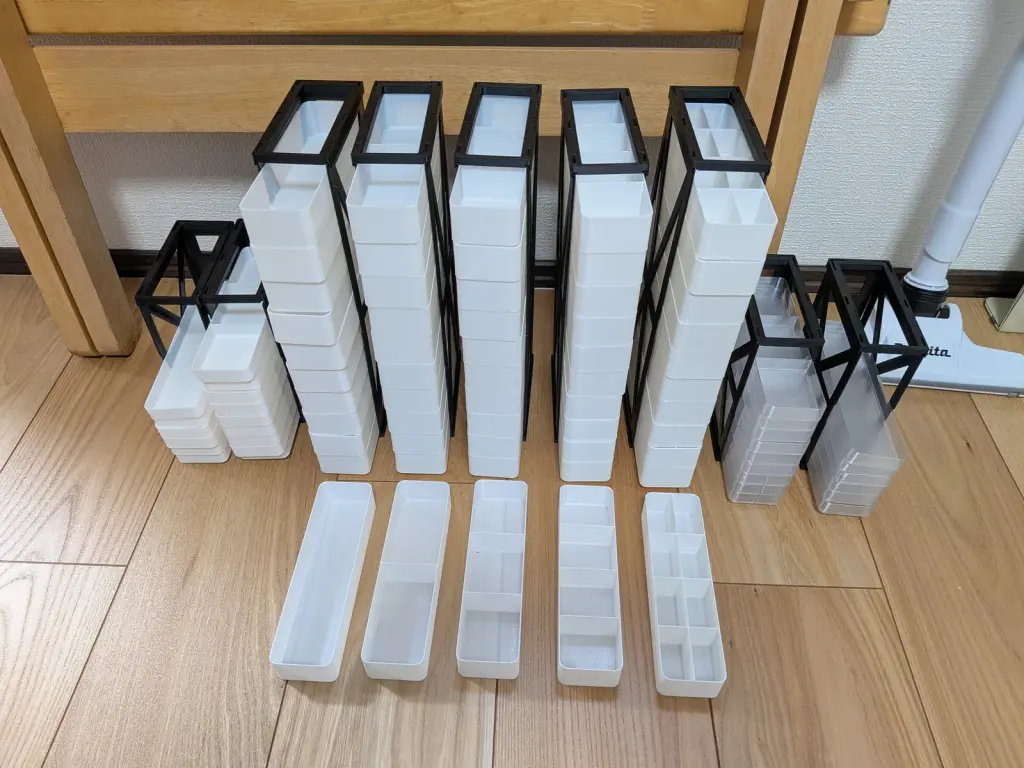もう一つの理由は、パーツを収納する前に仕切りのサイズを決めないといけない点がありました。収納したいパーツは増えたり減ったりします。将来必要になるサイズなんてわかりませんし、その度に作り直すのも非効率的です。苦労して作ったのにボツになりました。