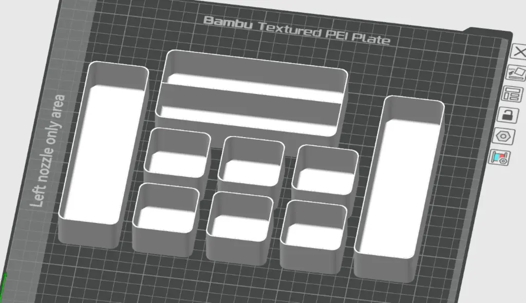 scene.export("plate.3mf")このプログラムはChatGPTが作ったサンプルコードで実際のものとは異なりますが、だいたいこんな感じで個々のトレイのSTLファイルを並べて、Webの画面と同じレイアウトで出力されるようにしています。実際には5mm間隔にして、プリント時にくっつかないようにしています。