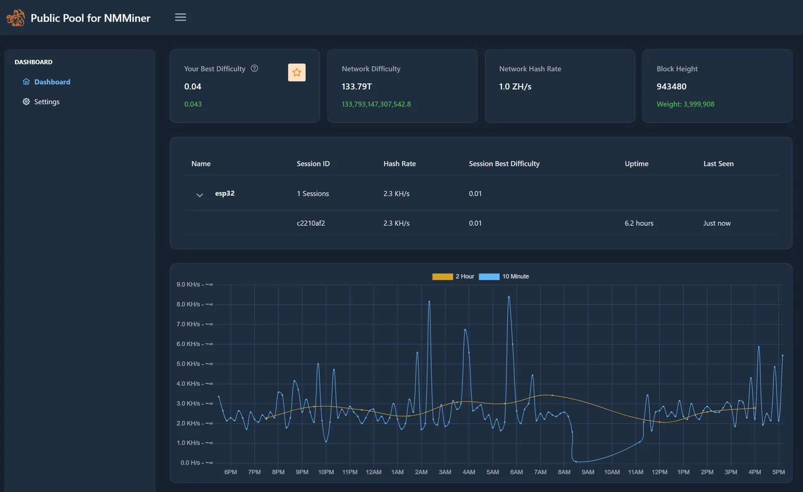 こちらはCH32V003 1台だけでやっている結果ですが、2.3KH/sとデバイス側と近い値になってますね。ちゃんとプールにも認識されているので、プールの誰かが掘り当てたら分け前がもらえるかもしれません。たぶん 0.001円くらい。