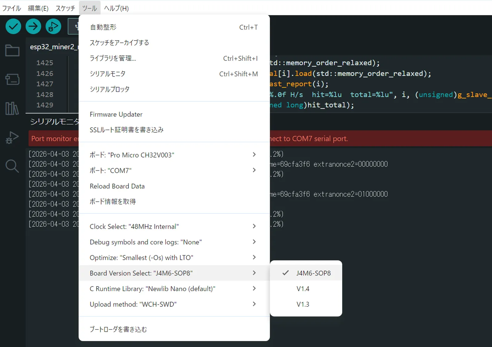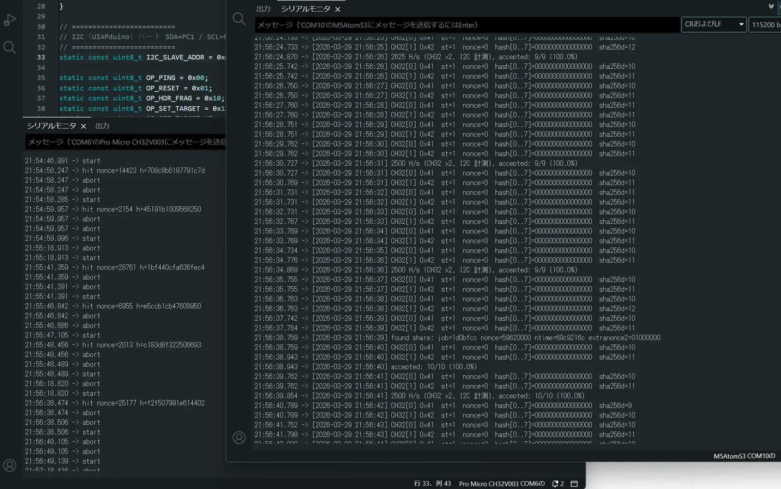 まずはAtomS3単独でマイニングできることを確認してから、CH32V003へ機能を移植します。使用したプログラムはこちら。このプログラムは中途半端なところで開発が止まってるので動かないかもしれません。