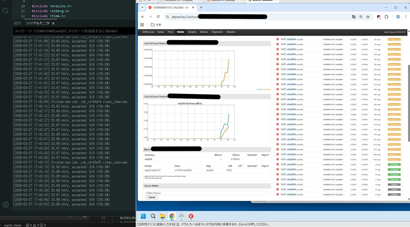 マイニングの仕組みとか方法は全然わからないので、cpuminer-multi を「git cloneして移植して」とAIに頼みました。Composer 2は結構賢くなりましたね。Composer 1.5のときはマイコン系のプログラムはうまくいかないことがあったのですが、2ではかなり良くなったと思います。それでもドツボにはまって抜けられないときはOpus 4.6に助けを求めたりしました。