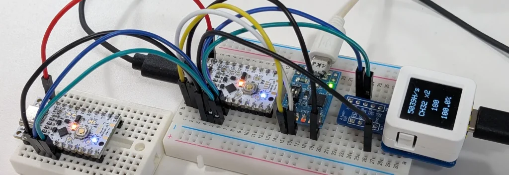 図ではCH32V003が2台接続されています。I2Cは1つのバスに複数のデバイスを接続できるので、このように複数台接続してハッシュパワーを高めます。なんてったって安いですから、どんどん増やしてたくさんマイニングしましょう。実際にマイニングしたところ、2台で2.5KH/sほど出ました。1台 1250H/s 程度です。